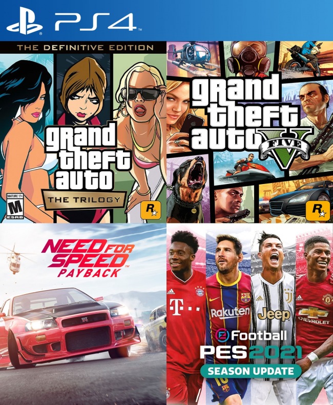3 JUEGOS EN 1 Grand Theft Auto GTA The Trilogy The Definitive Edition mas Grand Theft Auto (GTA) V mas NEED FOR SPEED PAYBACK mas PES 2021 PS4
