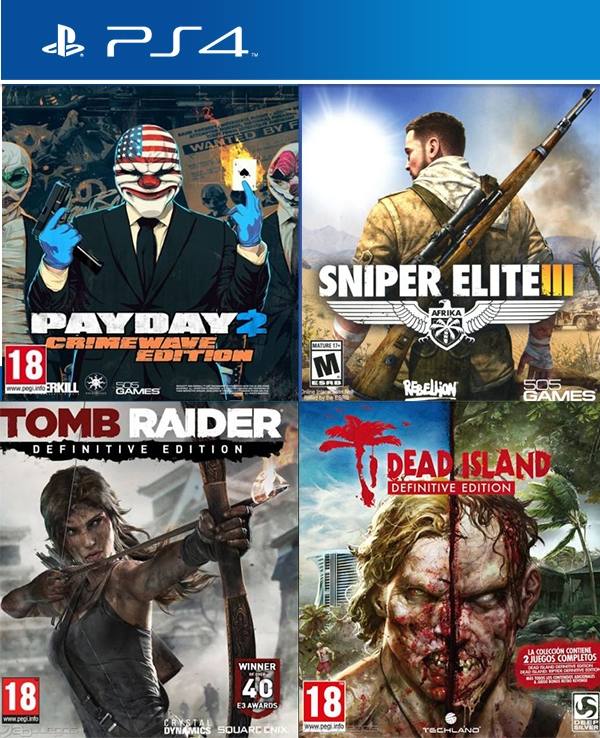 4 Juegos en 1 Payday 2 Crimewave edition Mas Sniper Elite 3 Mas Tomb Raider Definitive Edition Mas Dead Island Definitive Edition PS4